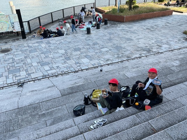 ポカポカ陽気の中、大川沿いの気持ちいい場所でいただきまーす!