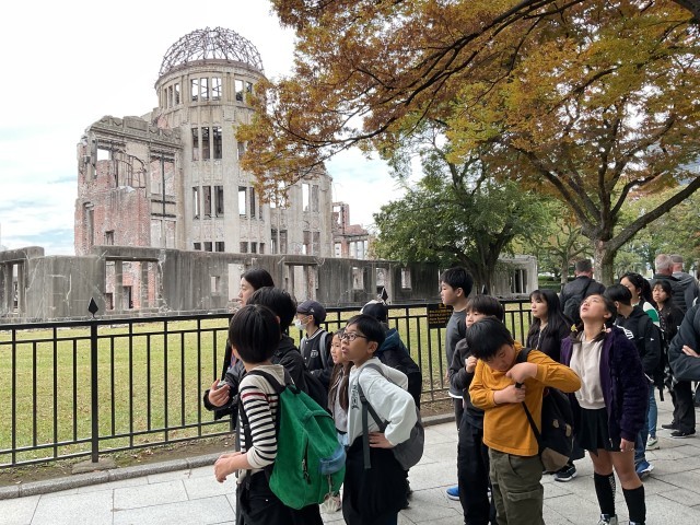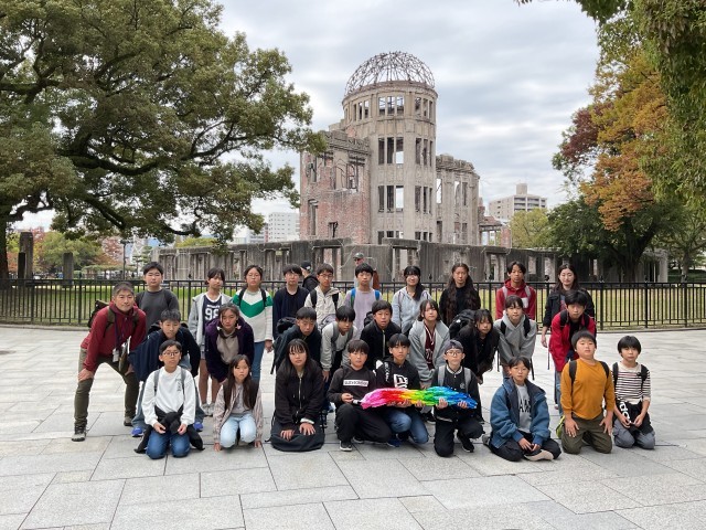 原爆ドームの前でクラス写真を撮り、周りをぐるっと一周しながら、保存されている原爆ドームをよく観察したり、説明文を読んだりしながら学びました。