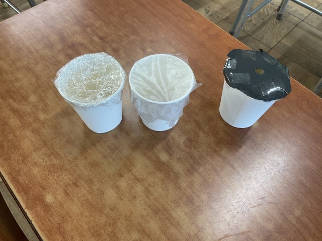紙コップにラップやビニル袋などが貼られたものを作り、それ越しに見るとどのように見えるのか。