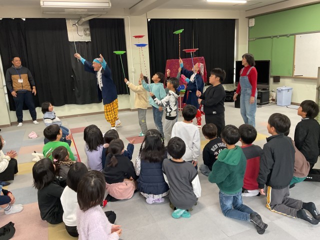 まずは皿回しから。体験もさせてもらい、大いに盛り上がりました。