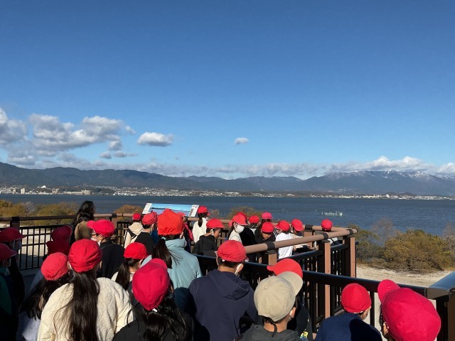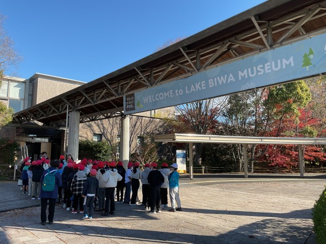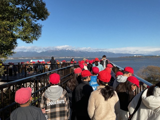 琵琶湖博物館に着きました。まずは、樹冠トレイルという、琵琶湖と森を感じて観察できる場所に行きました。見晴らしも良く、子どもたちからも「いい景色〜」と声が上がってました。写真奥の方の比良山地には雪が積もっていました。