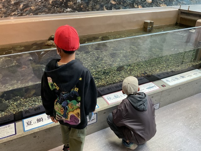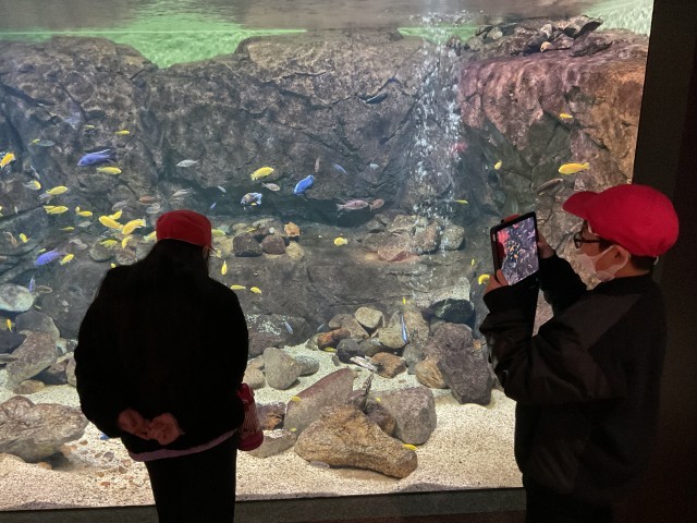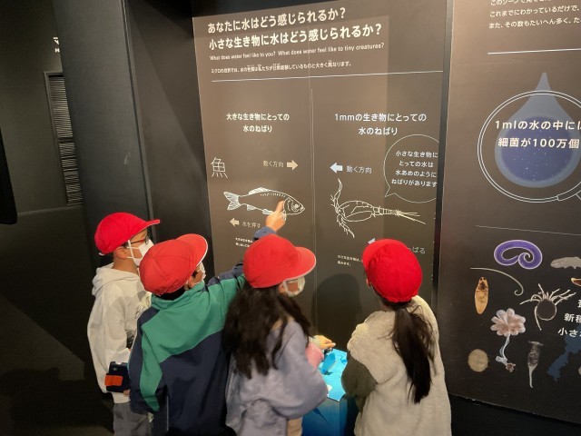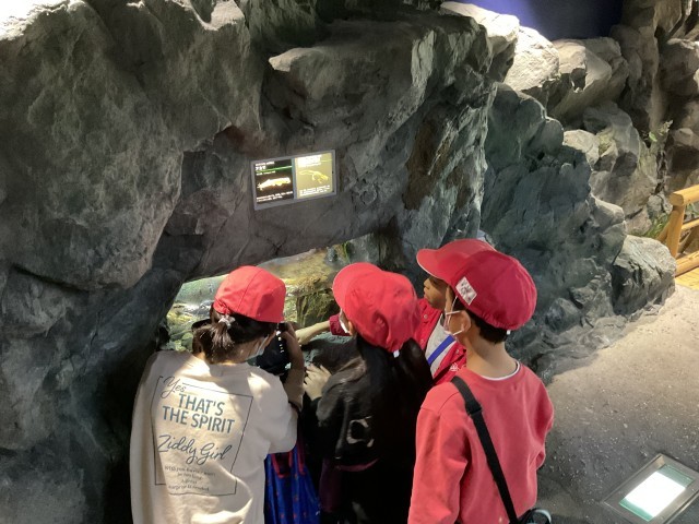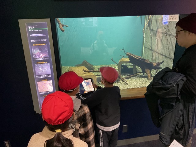 水族展示室です。琵琶湖にいる生き物をはじめ、様々な展示があります。初めて見る生き物や知っている生き物など、たくさんの生き物を熱心に見ていました。また、タブレットで気になるものを記録し、校外学習の振り返りに活用していく予定です。