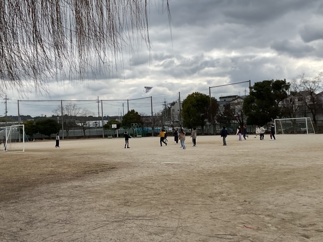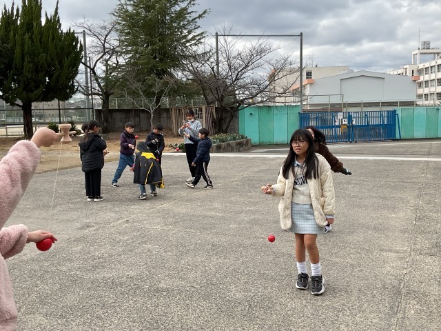 昔遊びにチャレンジ、ということで、けん玉とコマ回しと凧揚げをしました。