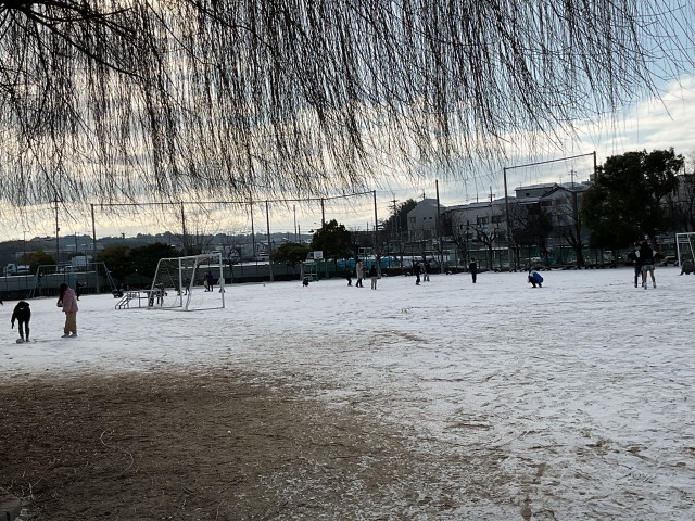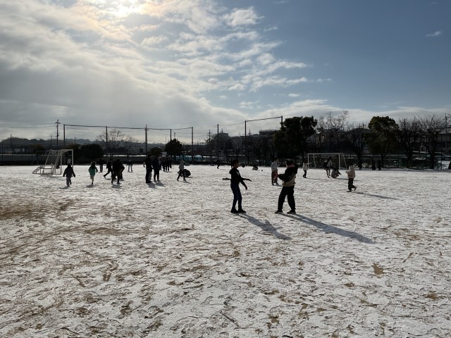 運動場に、一面の雪。夜のうちに積もったようです。