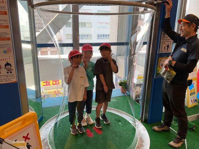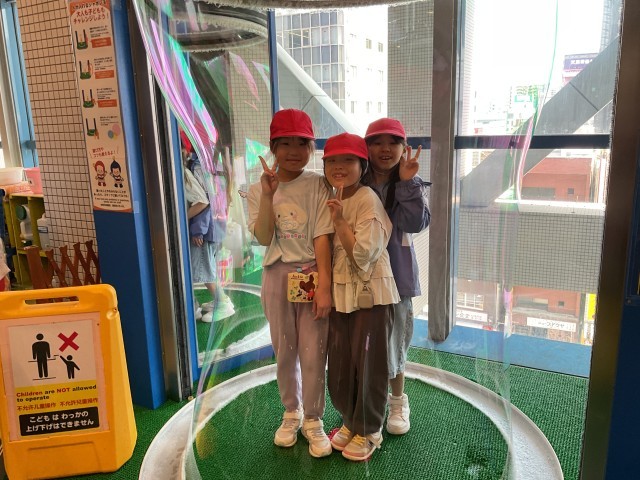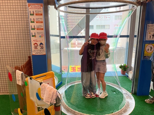 なるべく真ん中にきゅっと集まって、体がシャボン玉に当たらないようにすると、