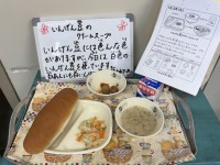 10月21日の給食メニューさつまいものクリームスープ鶏肉のマーマレード焼きキャベ...