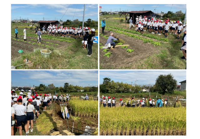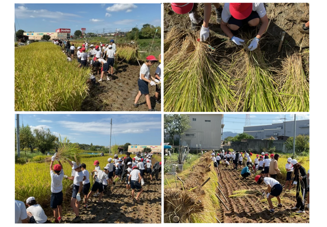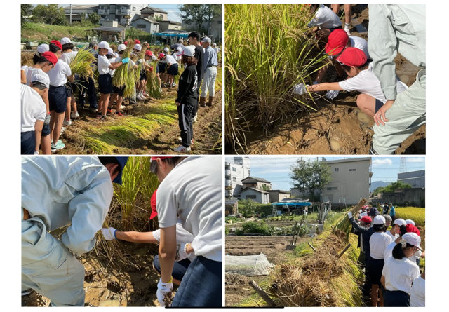 5年生は,地域の方々や農協の方々のご協力のもと,稲刈り体験をさせていただきました。6月に田植えをさせていただいた田んぼで,泥にまみれながら一生懸命に稲を刈り,束ねて干す作業に取り組みました。地域の方々が丁寧に育てられた稲は,見事な稲穂が育っていました。先日の雨の影響で,まだ田んぼの中はぬかるんでいましたが,互いに声をかけ合い,時間いっぱいまでがんばりました。