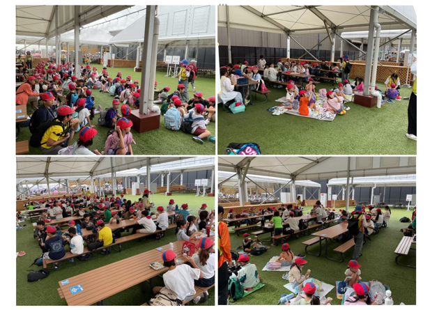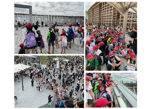 到着後は時間的に少し早かったのですが,団体休憩所が混み合う前に昼食にすることにしました。まだ空いている状態で,しっかり場所を確保してお弁当の時間にすることができました。食べやすい工夫がされたおにぎりやサンドイッチなどのお弁当を、子ども達は美味しそうに食べていました。食後は噴水を見たり,大屋根リングに上って散策をしたり,予定されていたパビリオンまでの時間を使って会場内の雰囲気を味わいました。