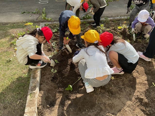 掘り起こす時には色々な虫も見つけました。「あ!これカブトムシの幼虫や!」「これは何の虫だろう?」子どもたちは虫にも興味津々でした。虫博士のように何の幼虫かすぐに答えられる子もいます。