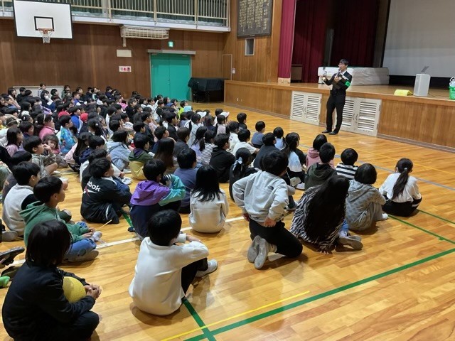 本日,不審者対応避難訓練を実施しました。教員が不審者役となり,休み時間に校内に侵入したという設定で行いました。子ども達は普段通りに休み時間を過ごしている中で,先生の指示に従いながら避難をしました。教室にいた子ども達はドアを閉めて机や椅子でバリケードを作り,外で遊んでいた子ども達は一ヶ所に集まって先生の指示を聞いていました。体育館に集合した後は,警察官の方からお話をいただきました。実際に起こってしまった事件の話などを交えながら,避難訓練の大切さを教えてくださいました。不審者対応に限らず,万が一の時のために今後の避難訓練も真剣に取り組んでいきたいところです。