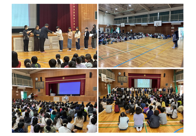 本日,児童集会が行われました。まずは枚方平和ポスター作品展の入賞者への表彰がありました。続いて,保健委員会からの取組みや3年生児童からのHKT(探究学習)でのお願いがあり,伝えたいことをしっかりと伝えることができました。最後には6年生から,10月に行った修学旅行の報告がありました。写真などを見せたり,クイズを出題したりしながら,みんなに協力してもらった折鶴を捧げた様子などを紹介していきました。平和のセレモニーで歌った歌を披露した際には,素敵な歌声に体育館にいるみんなが聴き入っていまた。