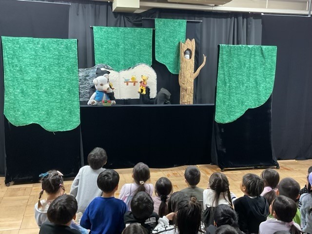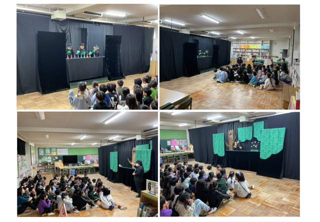 今日は人形劇団「どんぐるりん」の皆さんにお越しいただき,1年生と2年生が人形劇を鑑賞しました。前日から学校図書館に舞台を設置してくださり,準備万端。最初にご挨拶をした後,劇団の紹介や注意事項のお話をしていただきました。今日は二つのお話をしていただけるとのことで,子ども達も楽しみにしている様子でした。子ども達も知っている音楽や絵本の内容だったので,みんなで笑ったり,驚いたり,元気に盛り上がりました。