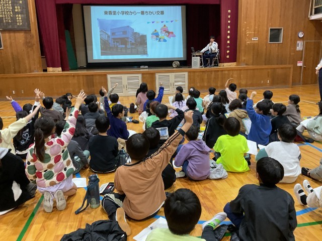 街の案内や落とし物の取り扱い、交通事故対応や交通整理、犯罪への対応や犯罪防止のためのパトロールなど町を守るためのいろいろなお仕事があることを子どもたちは真剣にメモを取りながら聞いていました。