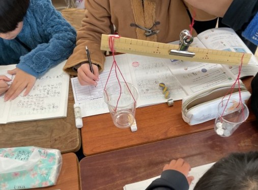 実際に計る前に予想を立てました。「これって15gくらい?」「いやいやもう少し重いやろ。」と班で相談しながらの活動です。