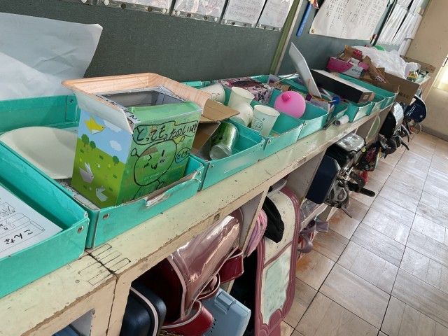 牛乳パック、空き箱、紙コップ。お家の方にたくさんご協力いただきました。ありがとうございます。
