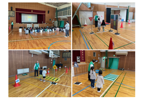 1年生は,交通安全協会の方にお越しいただき,交通安全の出前授業を受けました。まずは動画を観ながら,日常に潜んでいる危険を確認していきました。その後は体育館に設置されたコースをたどりながら,一時停止や踏切,信号のある交差点での行動を実際に動きながら学んでいきました。交通事故にあわないよう,交通ルールやマナーをきちんと守りましょう。