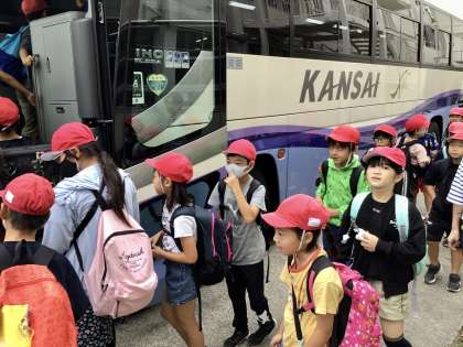バスは、これから旧田中家鋳物博物館へ向かいます。子どもたちは今日も元気いっぱいです。1日安全に楽しみながら過ごせたらと思います。では、いってきます!