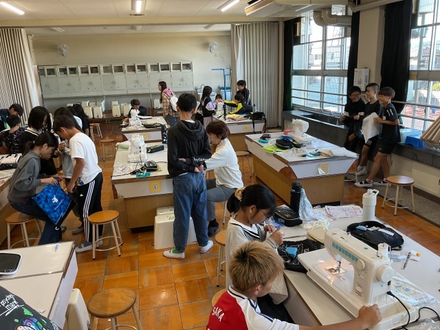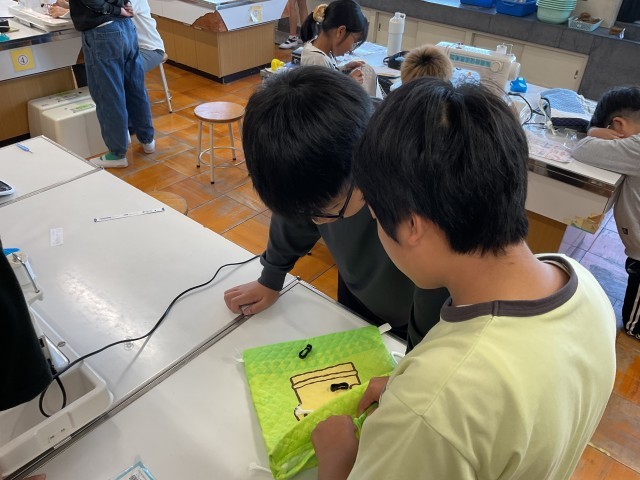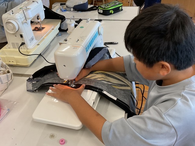 6年生は、ナップサックを作っていました。これは修学旅行に持参するのですかね?最後の仕上げに、友達のサポートが入ります。