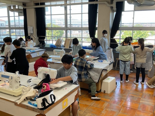5年生は、エプロンの完成を目指して、ミシンを動かしたり、針で○縫いに挑んだりしていました。