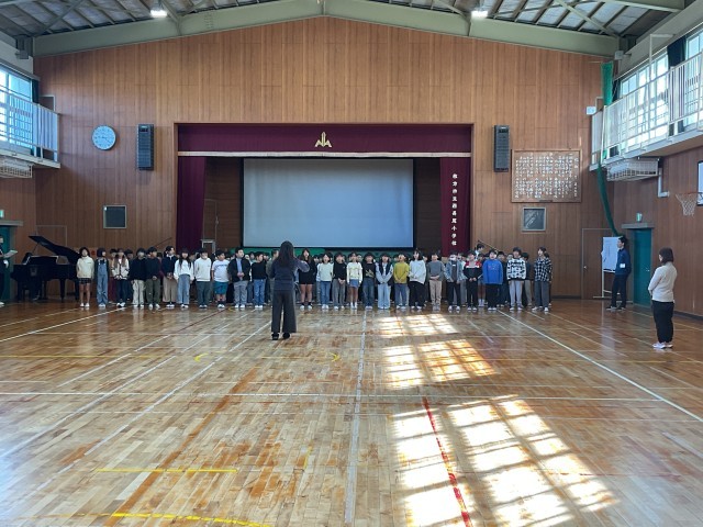 音楽会に向けて3、4年生が合同で練習し始めました。もちろん、以前からも少しずつ行なっていますが、今日は自分の位置を確かめながらの練習です。