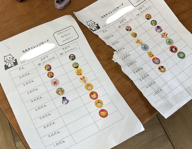 見学していると、子どもたちが「九九チャレンジカード」の九九クリアーシートを見せてくれました。頑張れって!!
