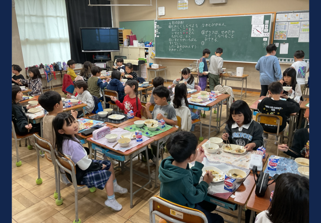 ちょうど1年前は、10時半下校だった1年生が今は2年生。既に給食の用意ができました。