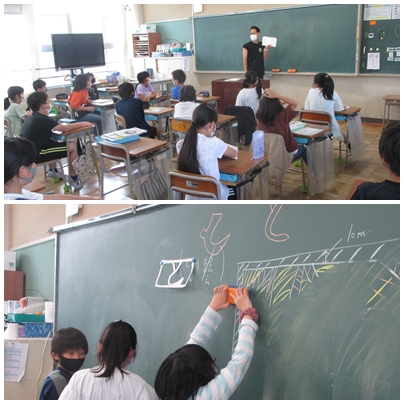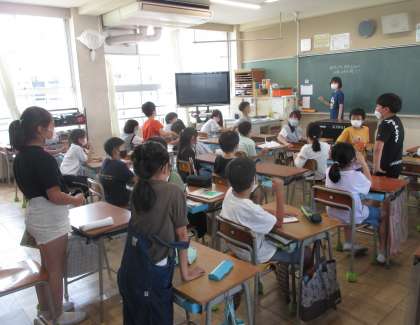 授業の後の休み時間では、和やかな雰囲気の中、係の児童が黒板をきれいにしていました。