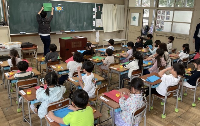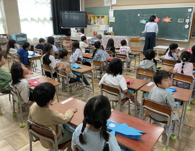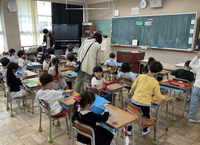 今日は、鯉のぼりをつくっている1年生を見学しました。