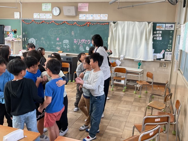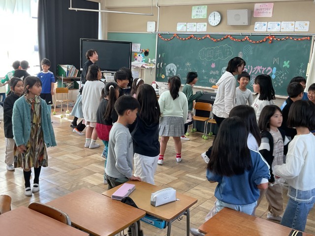実習生の先生を囲んでの学級活動で、ゲームをしたり、話し合ったり。