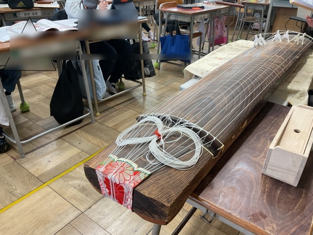 お琴を使っての授業でした。とっても、珍しい楽器ですね。今日は、なんと「さくら さくら」の音階を使っての作曲をしました。
