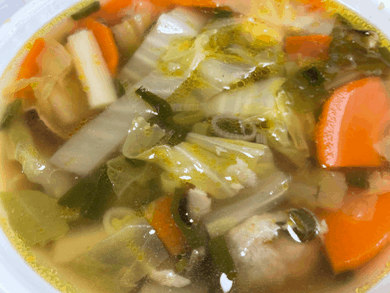 1日目は、青森県の郷土料理「せんべい汁」です。肉や野菜などを入れた汁に「南部せんべい」を割り入れて煮込んだ郷土料理です。
