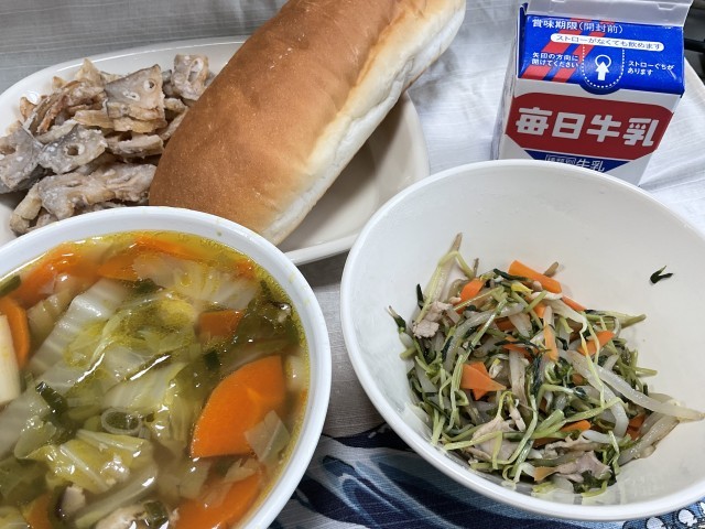家ではなかなか見慣れない料理だと思うのですが、レンコンの唐揚げは、このパリッとした食感がよく、更に美味しかったです。スープも美味しかったです。豆苗の炒めものの味も、しっかりしていてパンが進みました。