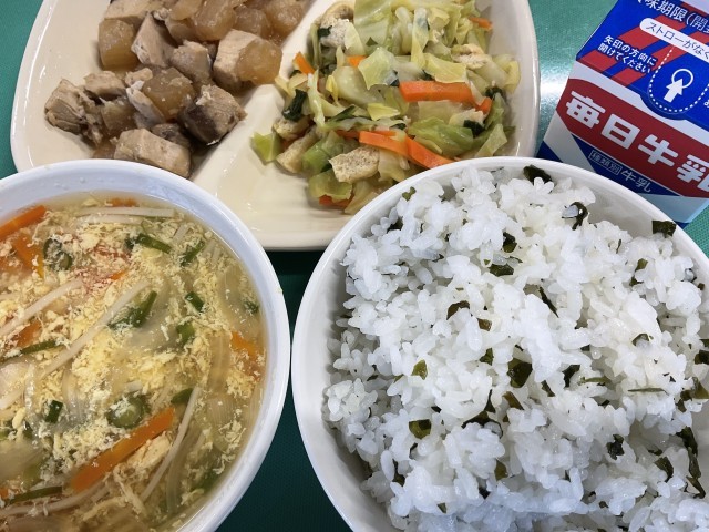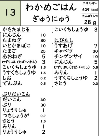 山田東小学校のお友達が考えてくれた献立です。(令和7年度枚方市学校給食コンテスト入賞作品)捨てられがちな大根の葉を使った、エコで栄養満点のところがポイントだそうです。大根の根は、味噌汁の中に入っていて、大根1本まるまるおいしく食べられる献立になっています。