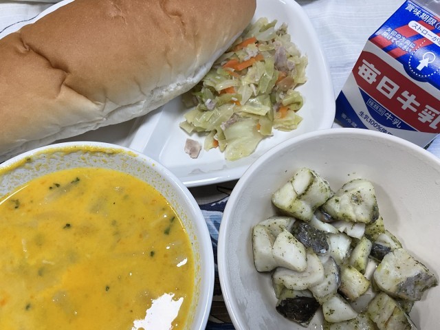 今日の赤魚のバーベキューソースは、とてもニンニクが効いていました。魚もとっても美味しく頂けました。ミネストローネもパンととても合いました。美味しかったですね。