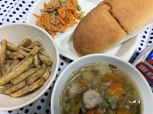 ツナとにんじんのサラダも定番ですが、私のお気に入りです。はるキャベツと鶏団子のスープも春を感じさせる大おかずでした。