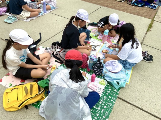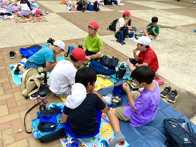3年生、枚方まで戻ってきて、お弁当を食べました。