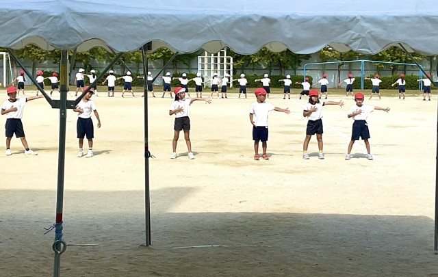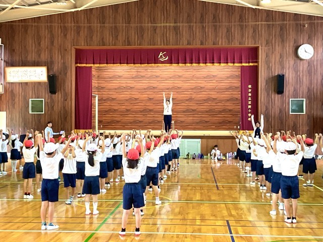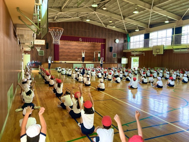 まずは、体育館で移動中の演技についてしっかり確認した後、運動場に出ました。