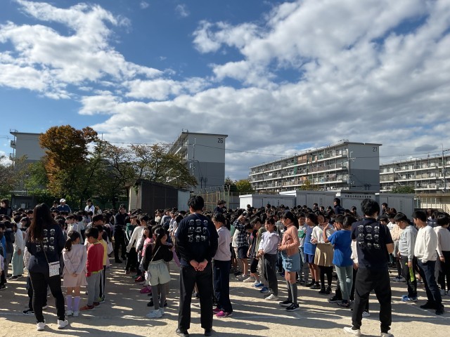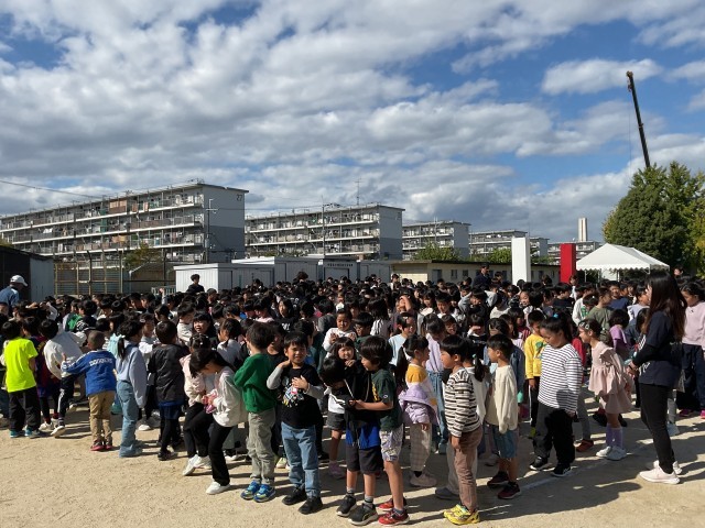 昼休みに再び、全校児童でグラウンドに出て、今度は集合写真を撮影してもらいました。