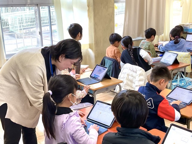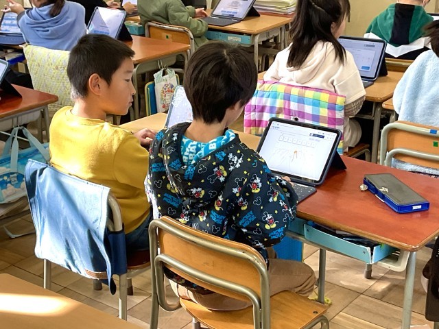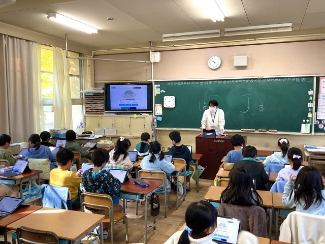 2年生が、ICT支援員さんに教えてもらいながら、タイピングについて学習しています.