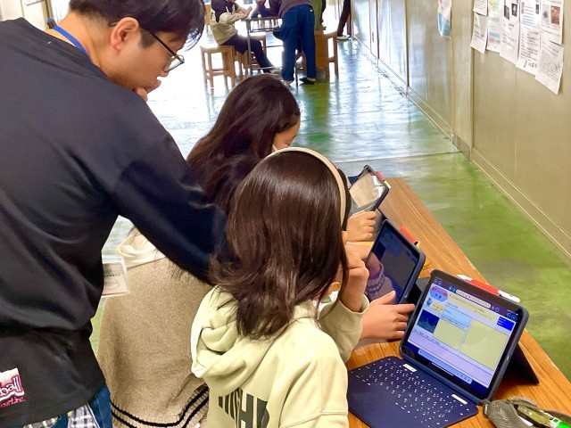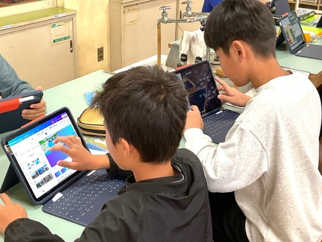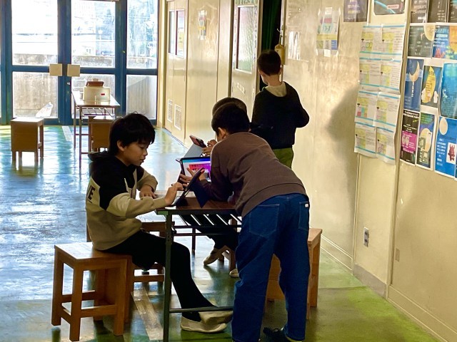 理科室の前の廊下にまで、学びの場を広げて取り組んでいます。