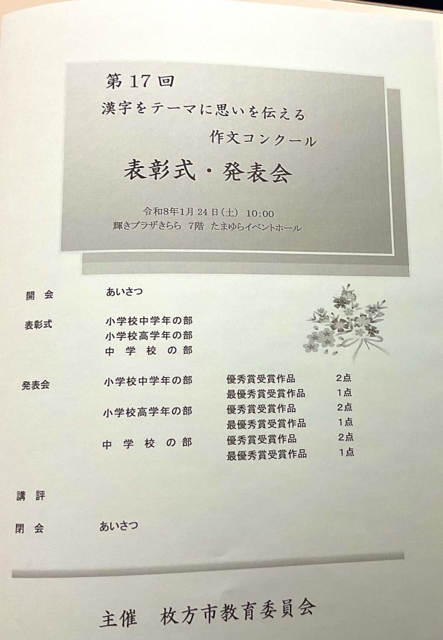 枚方市教育委員会主催の第17回漢字をテーマに思いを伝える作文コンクール 表彰式・発表会が輝きプラザきららで行われました。