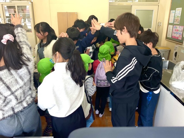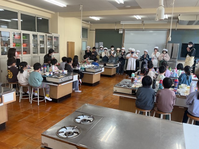 家庭科室で給食の配膳や下膳をお手伝いした5年生。やさしく、献立や食器のしまい方を説明していました。