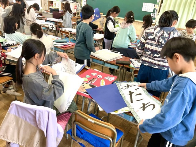 3年生、これまでに仕上げた図工や毛筆の作品をまとめています。