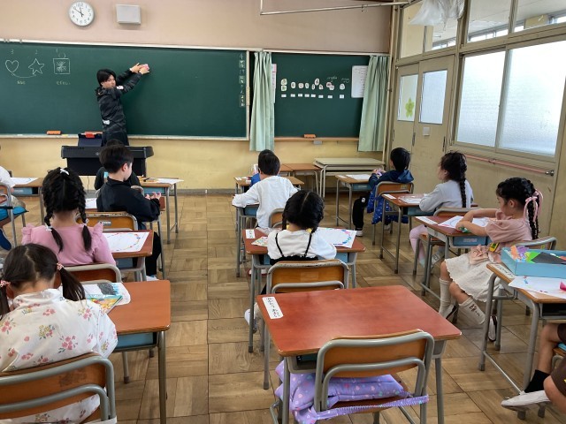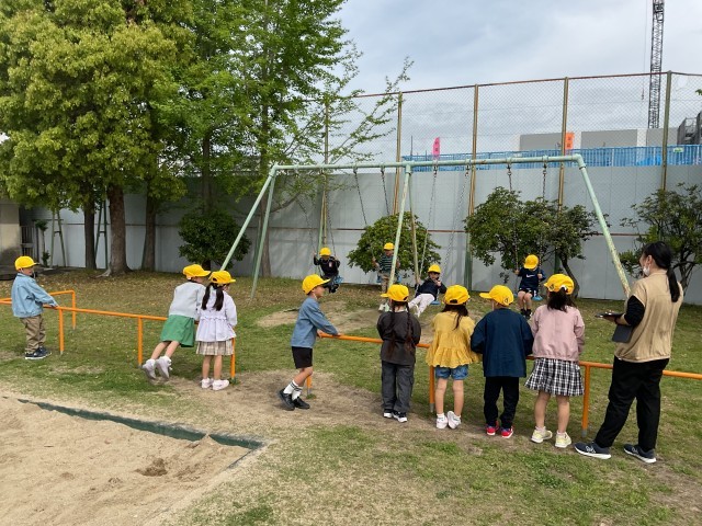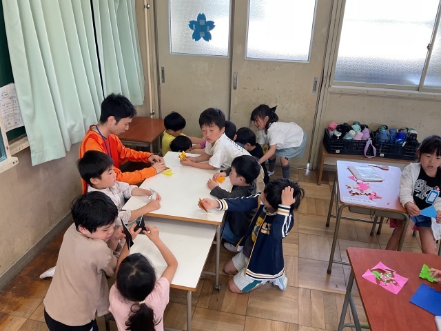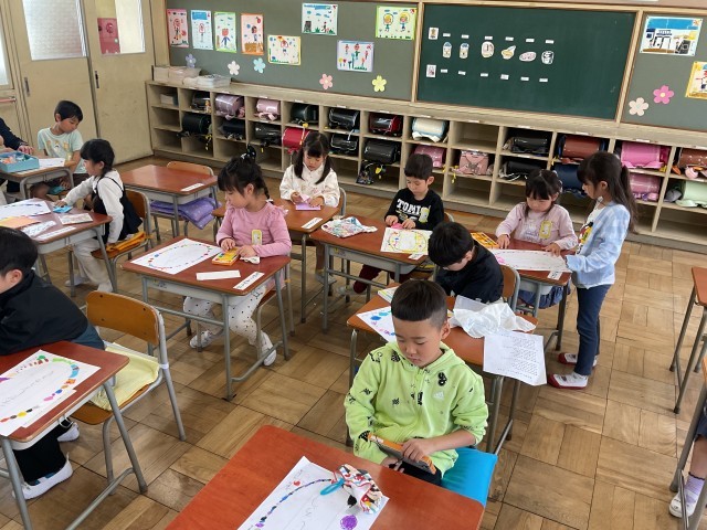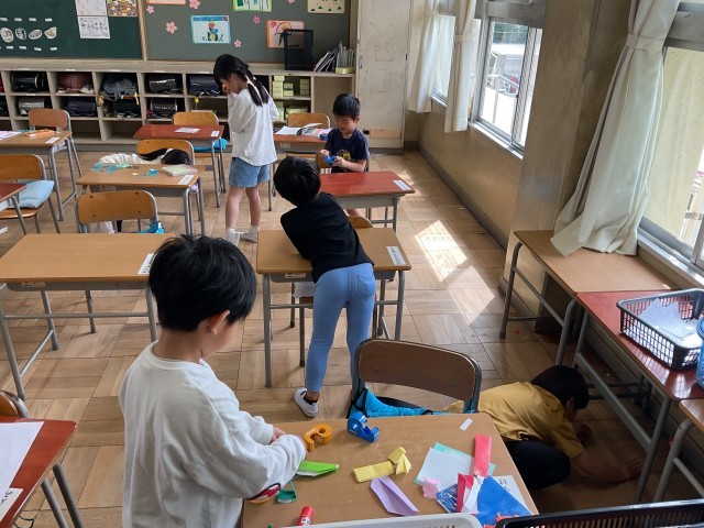 1年生。とても天気の良い中で外遊びをしたり、折り紙遊びをしていました。