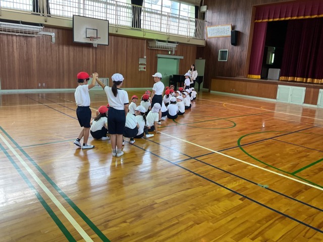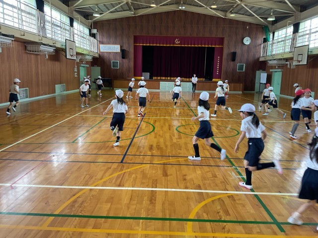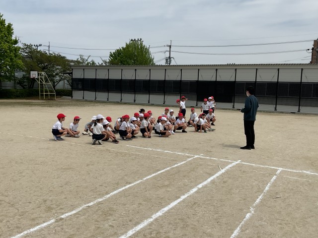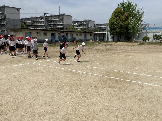 3年生。整列の確認の後の鬼ごっこや50m走に取り組んでいました。
