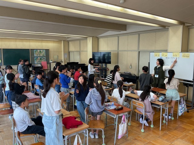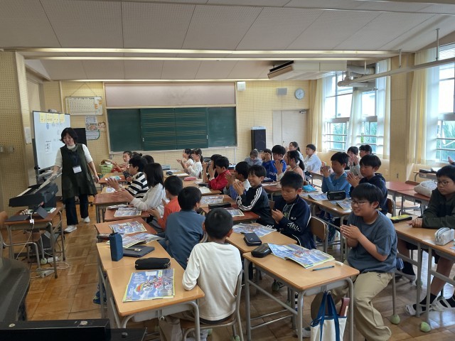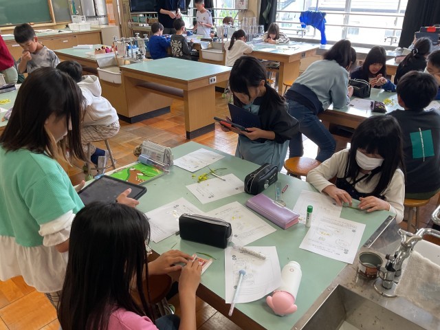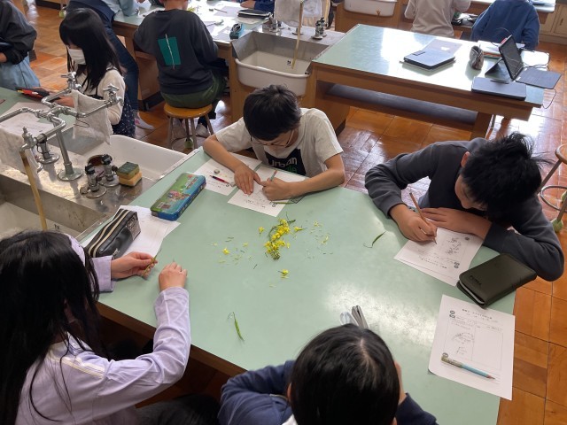 5年生。理科でアブラナの花のつくりについて、実物を分解したり、iPadで写真を撮ったりして細かく観察をしていました。音楽では、歌の練習をした後に色々なリズムの学習をしていました。拍子(カッコ良く言うとClap)も立派な楽器です。