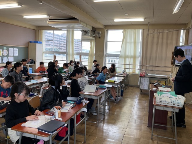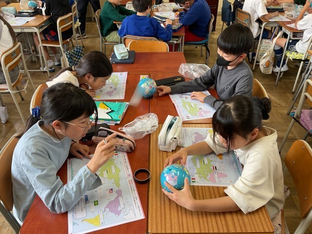 5年生。社会では、地球儀と世界地図から世界の大陸や海洋、国の名前を調べています。算数は体積の学習です。展開図を作りながら直方体や立方体の性質を探っています。