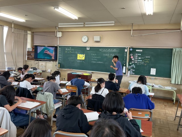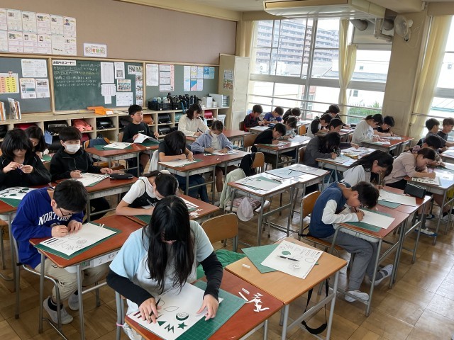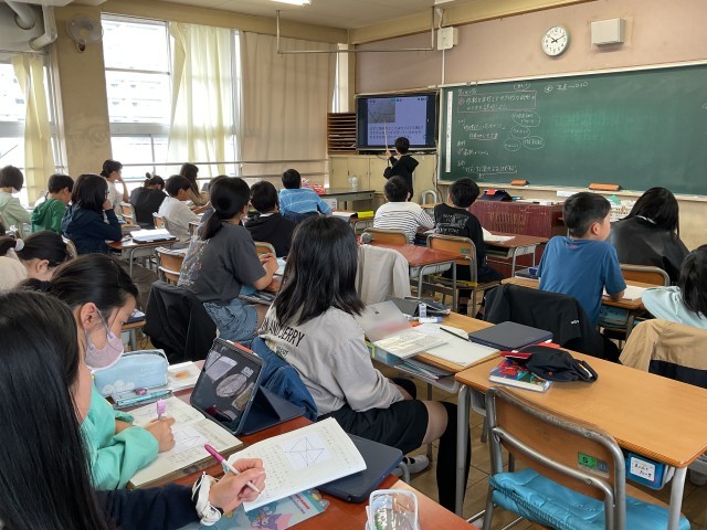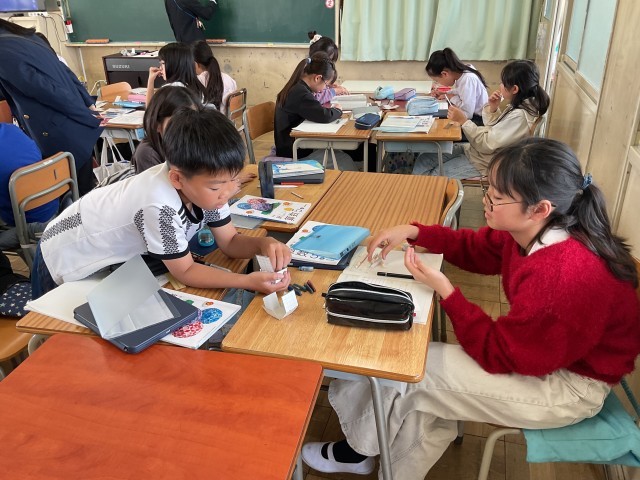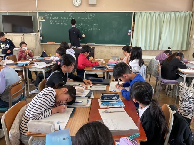 6年生。図工では「紙が奏でる形と色のハーモニー」ということで、様々な色画用紙を様々な模様に切り取って重ね合わせることで作品を創っていきます。算数では、「点対称」の性質について調べ、友達に説明ができるように頑張っています。