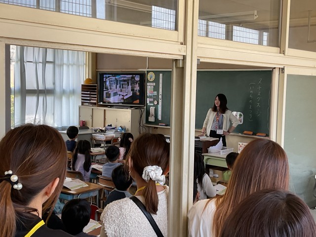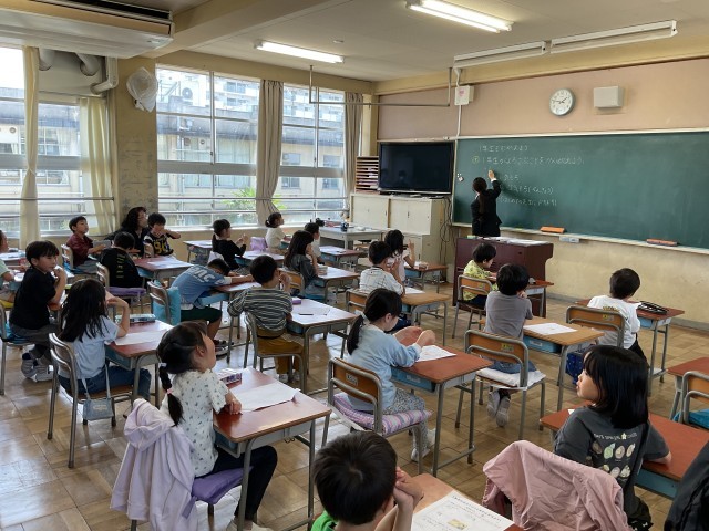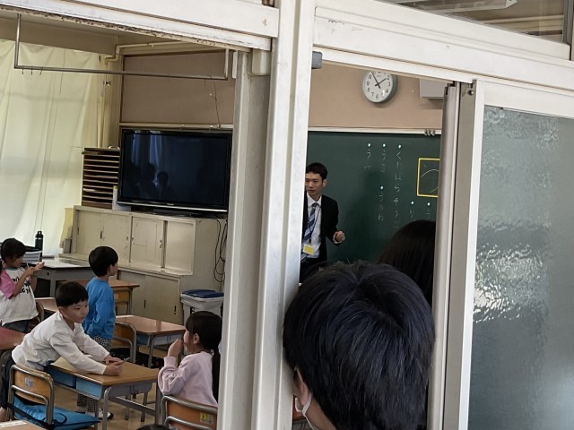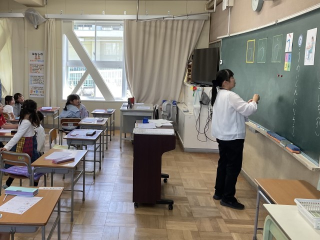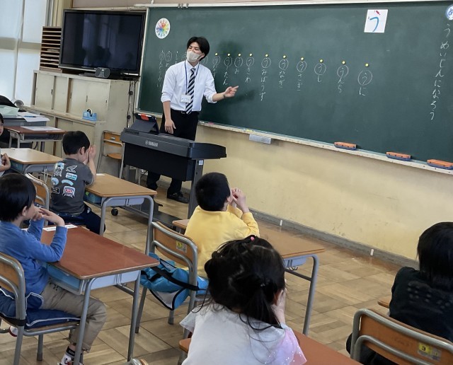 1年生は国語。ひらがなの「う」の書き方や言葉集めをしていました。