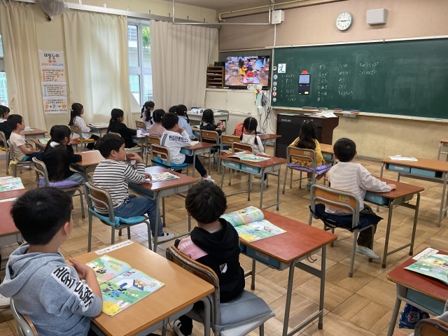1年生。自分たちの遊んでいる様子の動画を見て、自分たちの動きを学んだり、授業参観で学習した「う」に続き、「え」の練習をしたり、学校での一場面でどのように声掛けをしたらいいのか考えたりしていました。